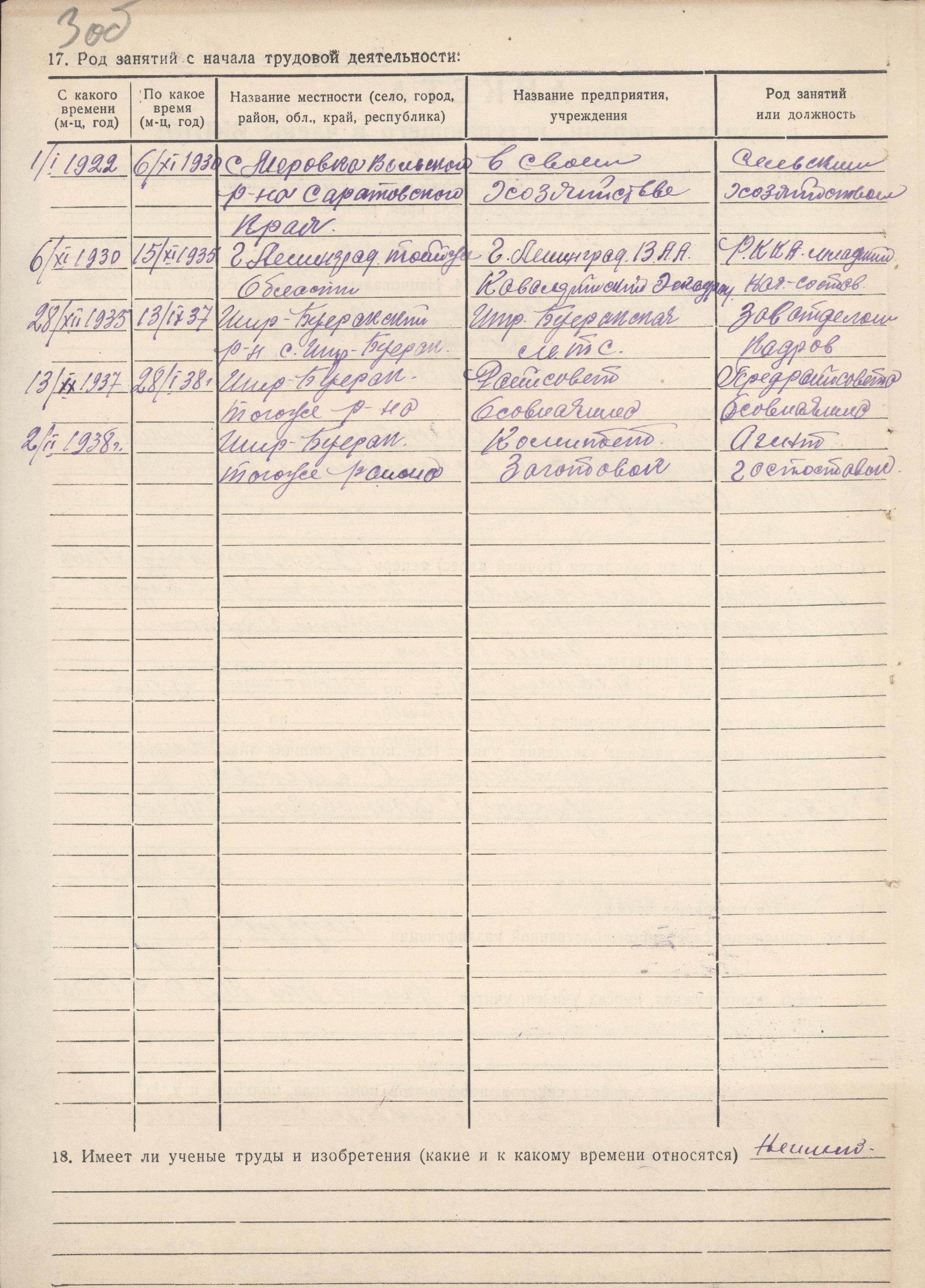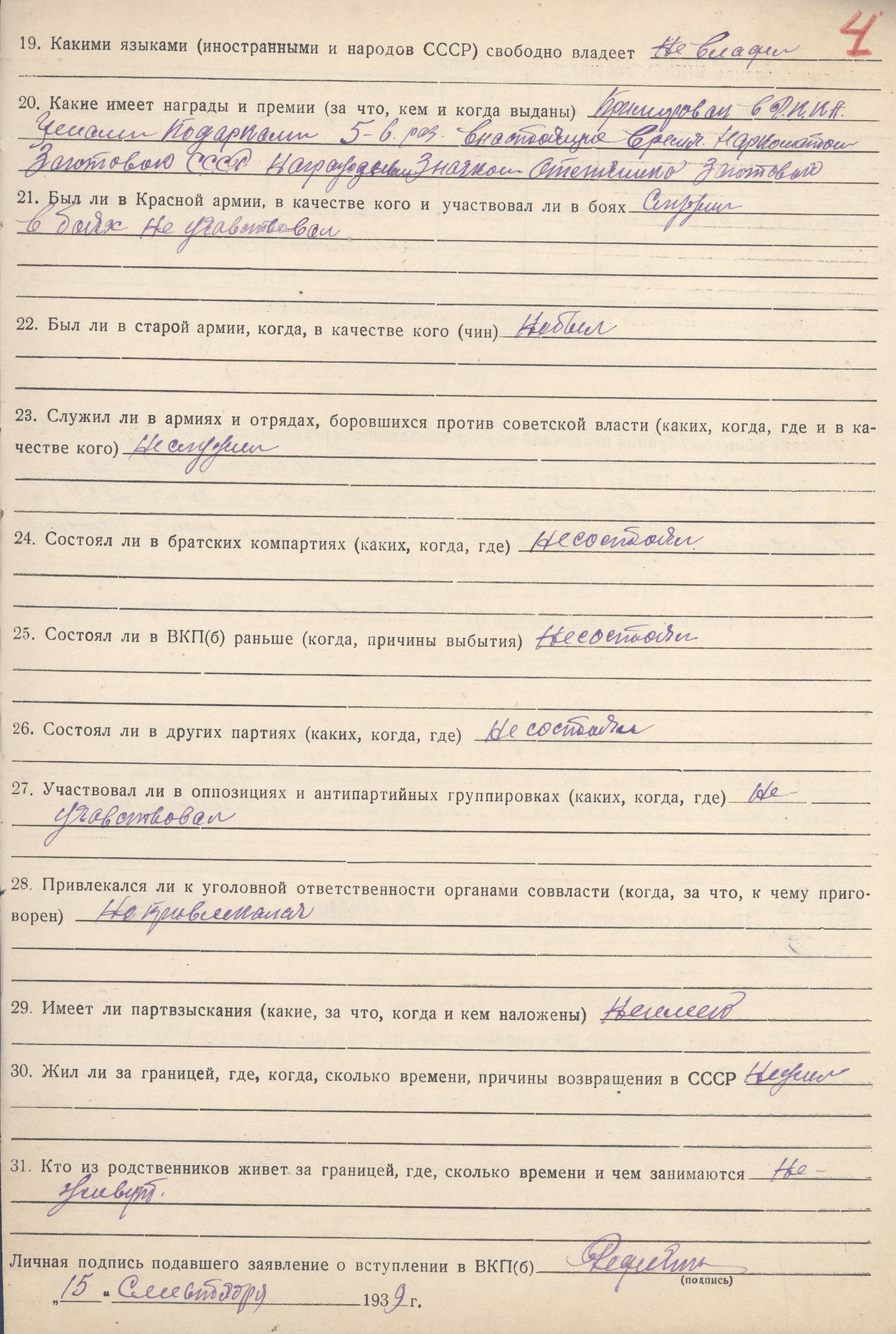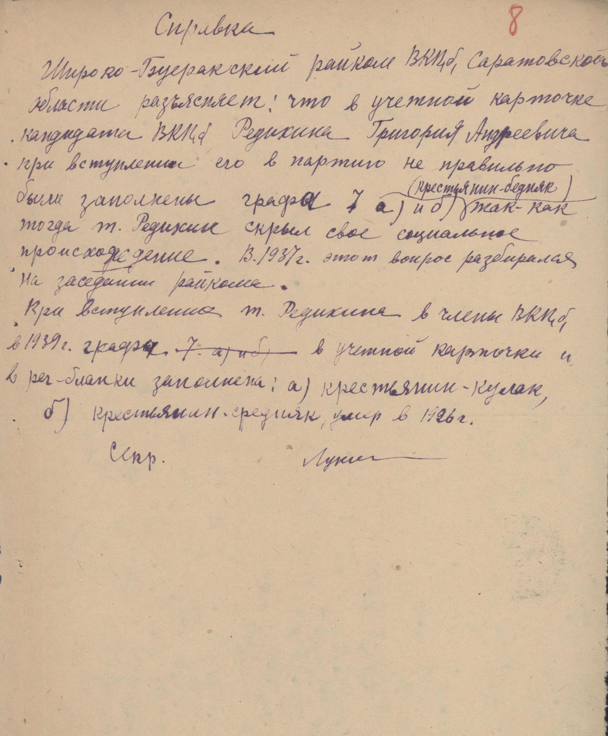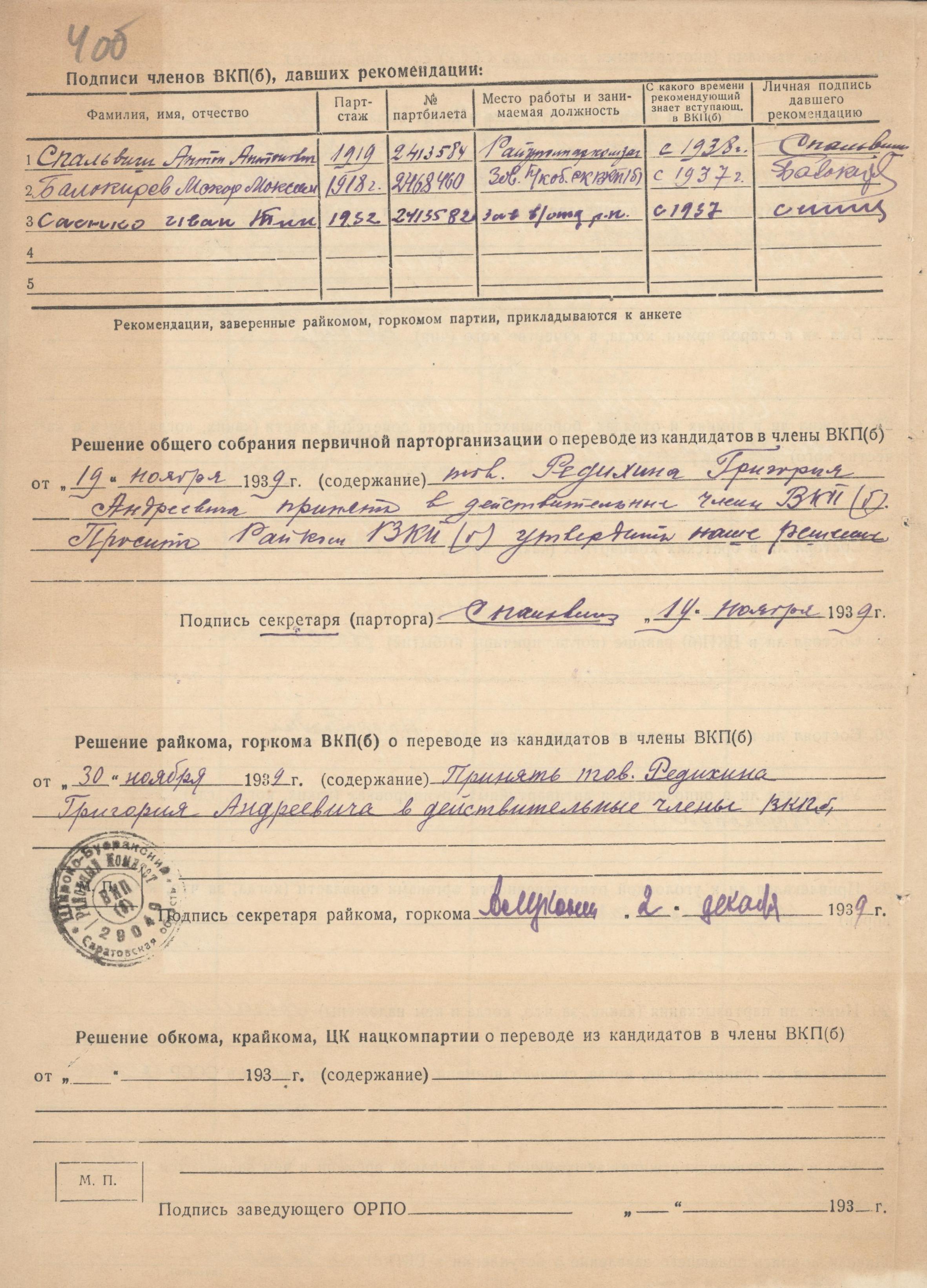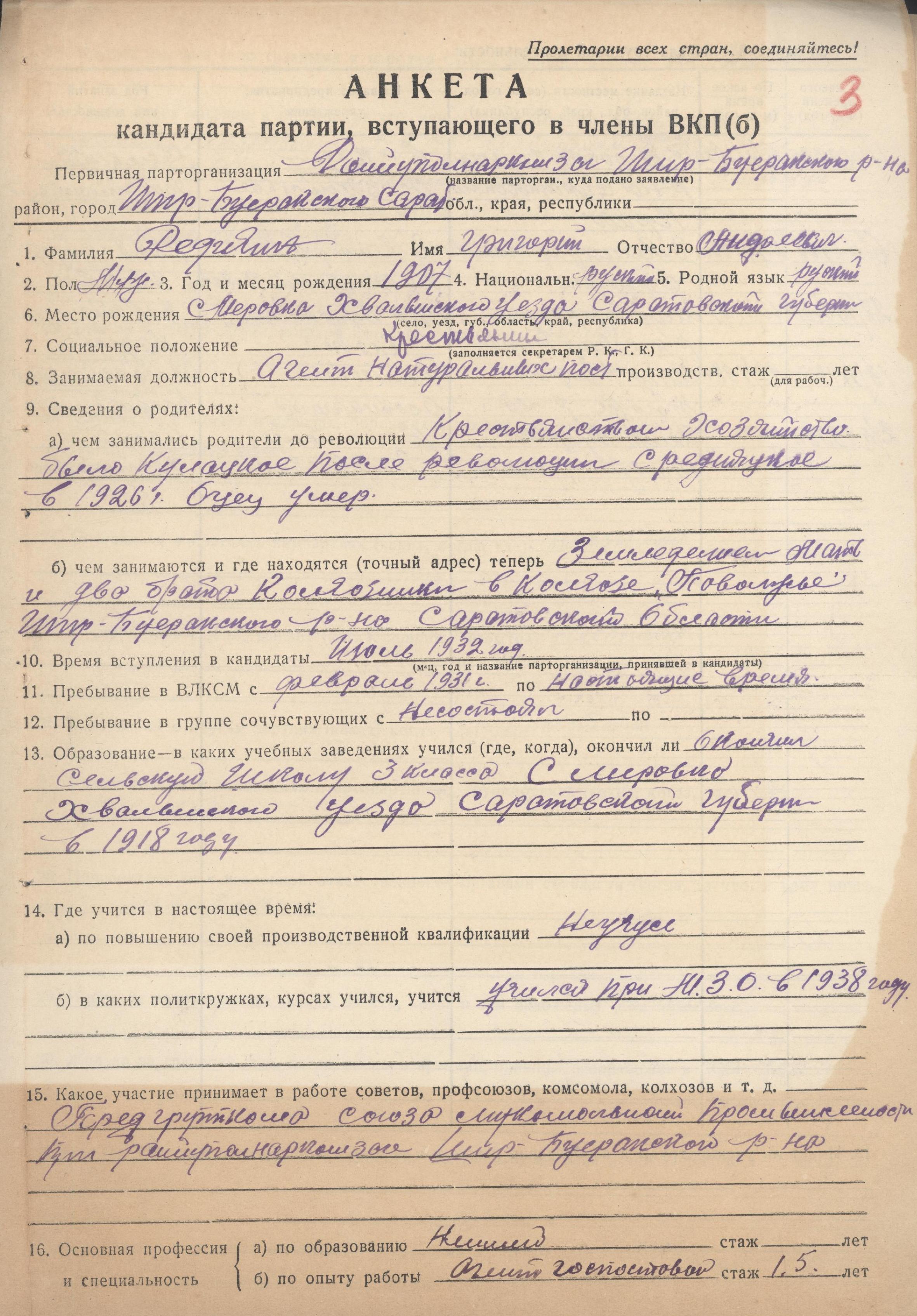 Анкета кандидата партии Редихина Г.А., вступающего в члены ВКП(б) (ГАНИСО (Саратов) Ф.1573 Оп.15 д.275)
