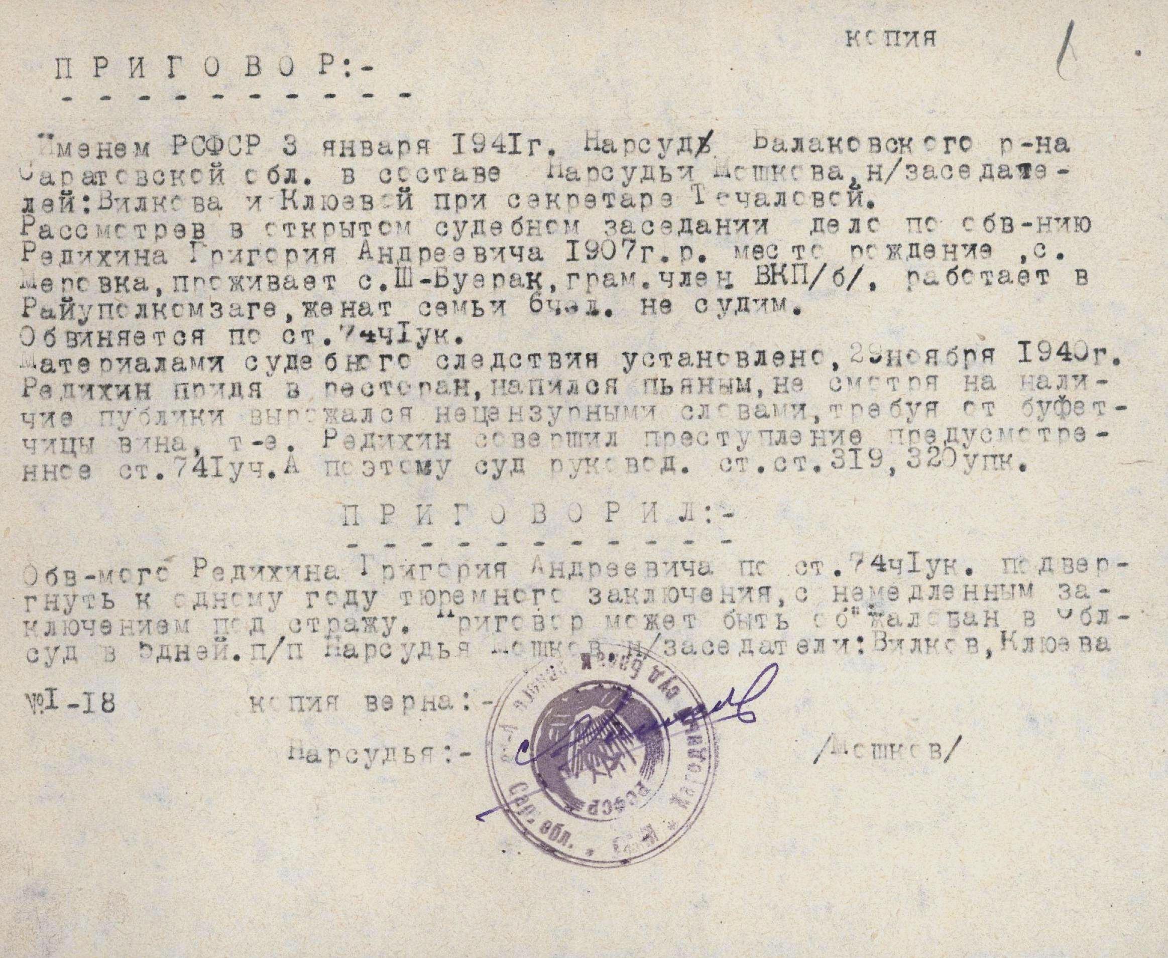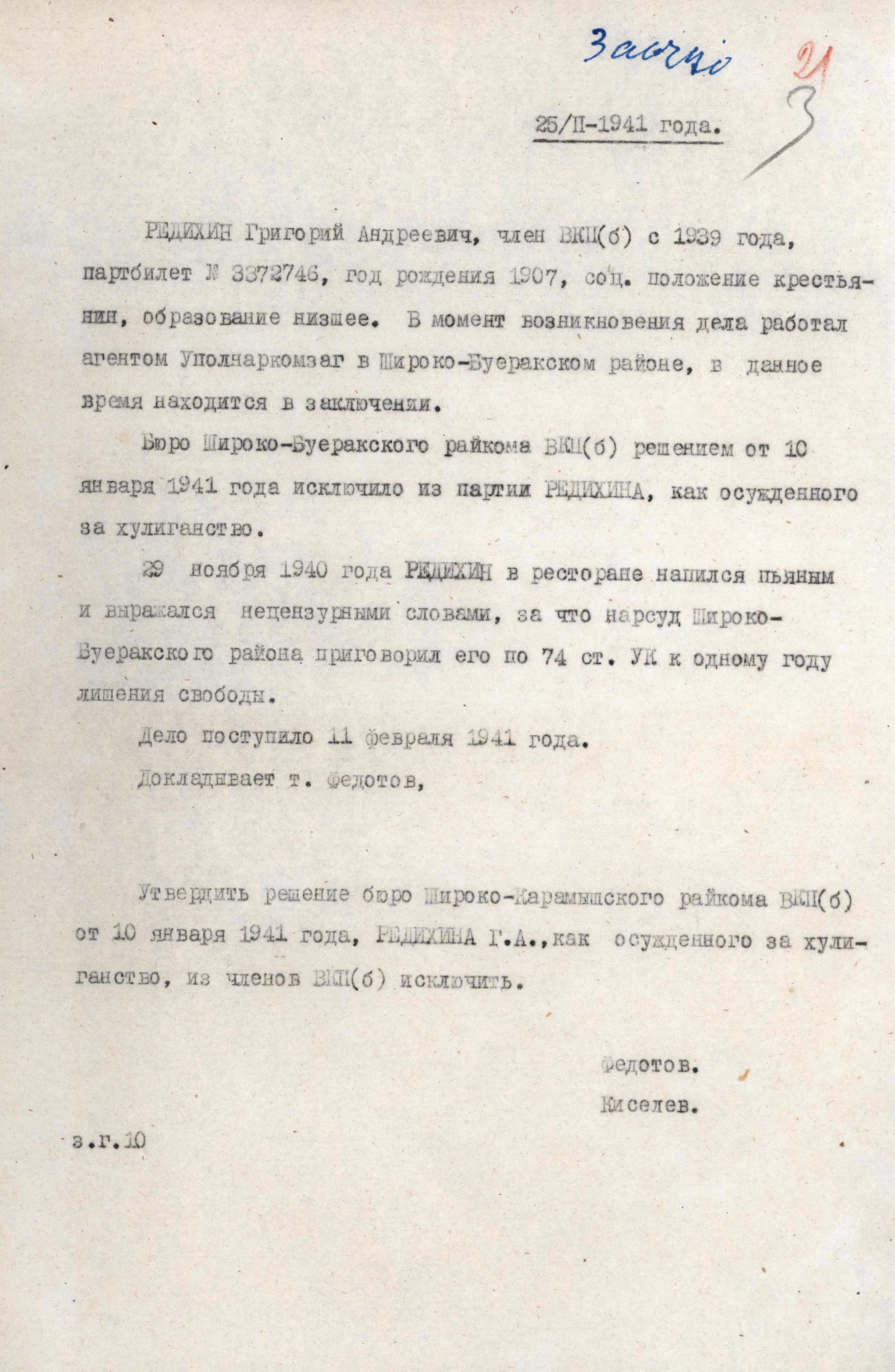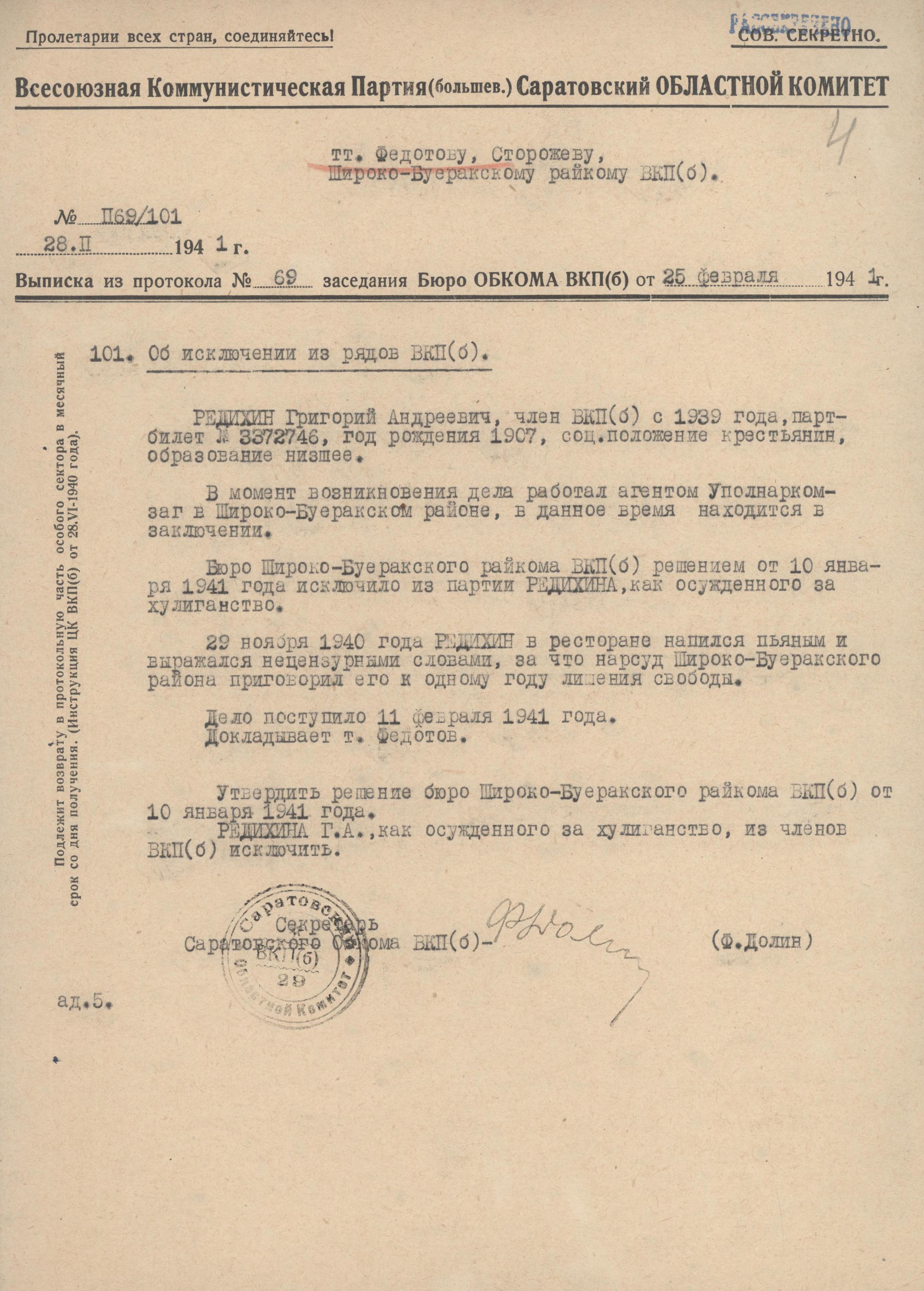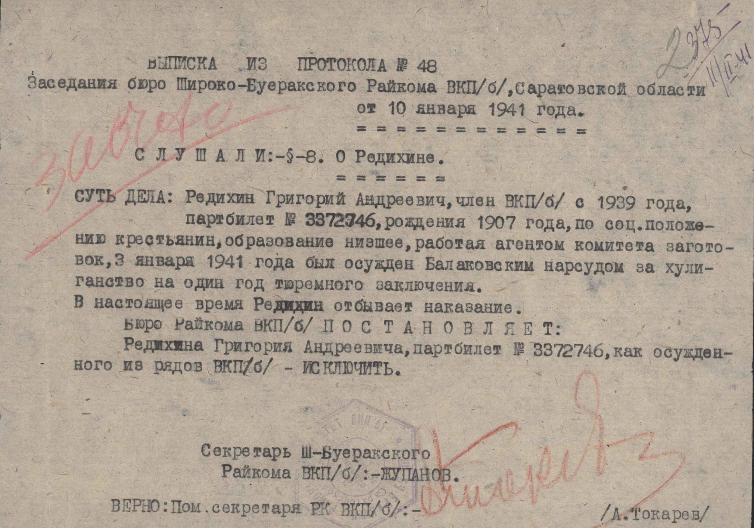 Дело об исключении из партии Редихина Г.А. (ГАНИСО (Саратов) Ф.594 Оп.1/ПК д.7896)